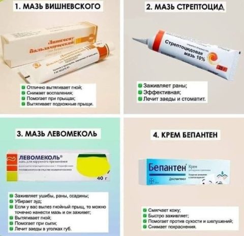 1. Мазь Вишневского — вытягивает гной, снижает воспаление, помогает при фурункулах и прыщах. 2. Стрептоцидовая мазь — ускоряет заживление,...
