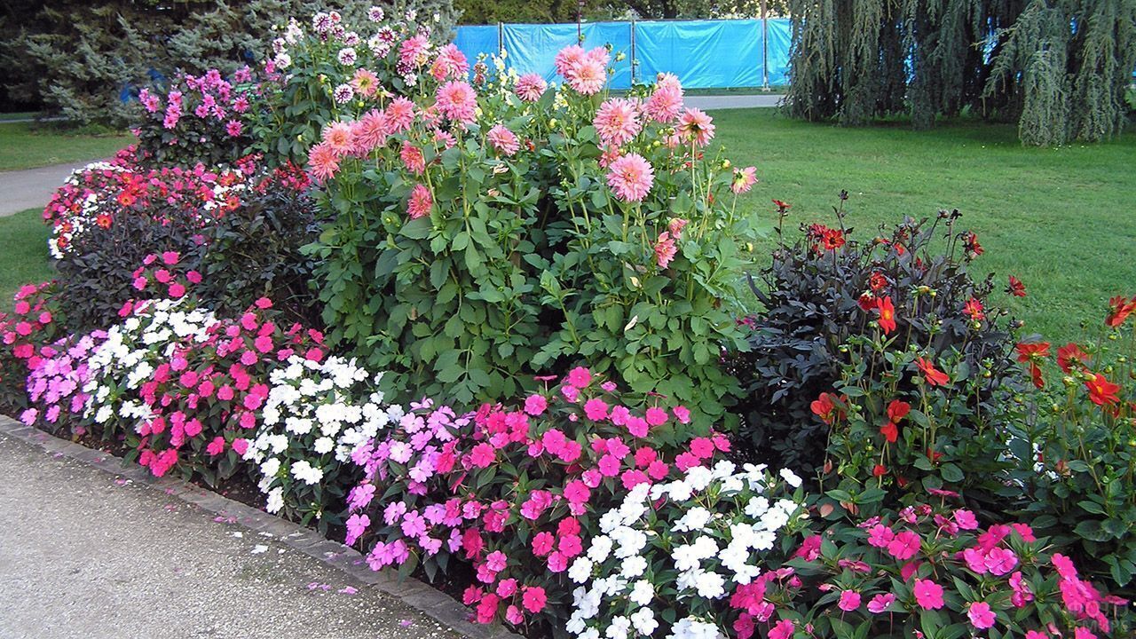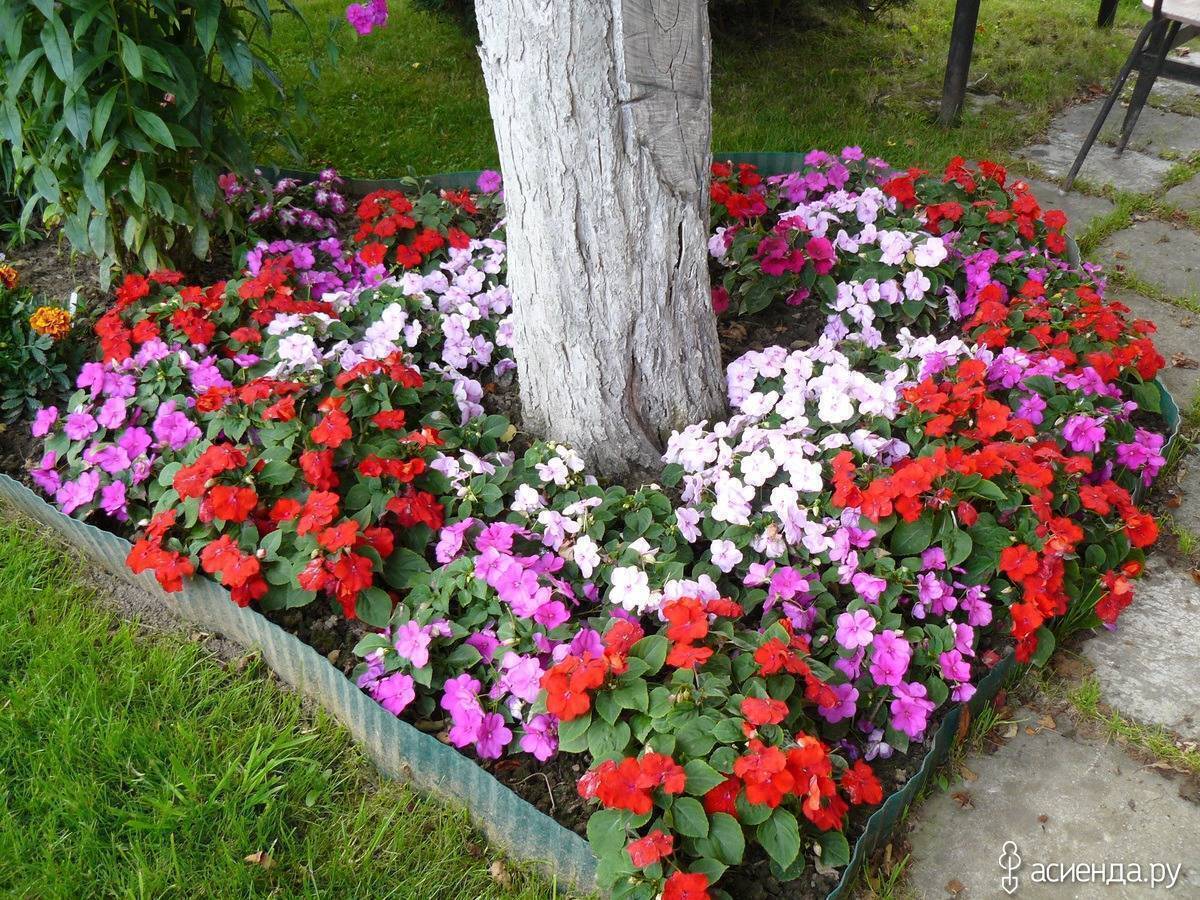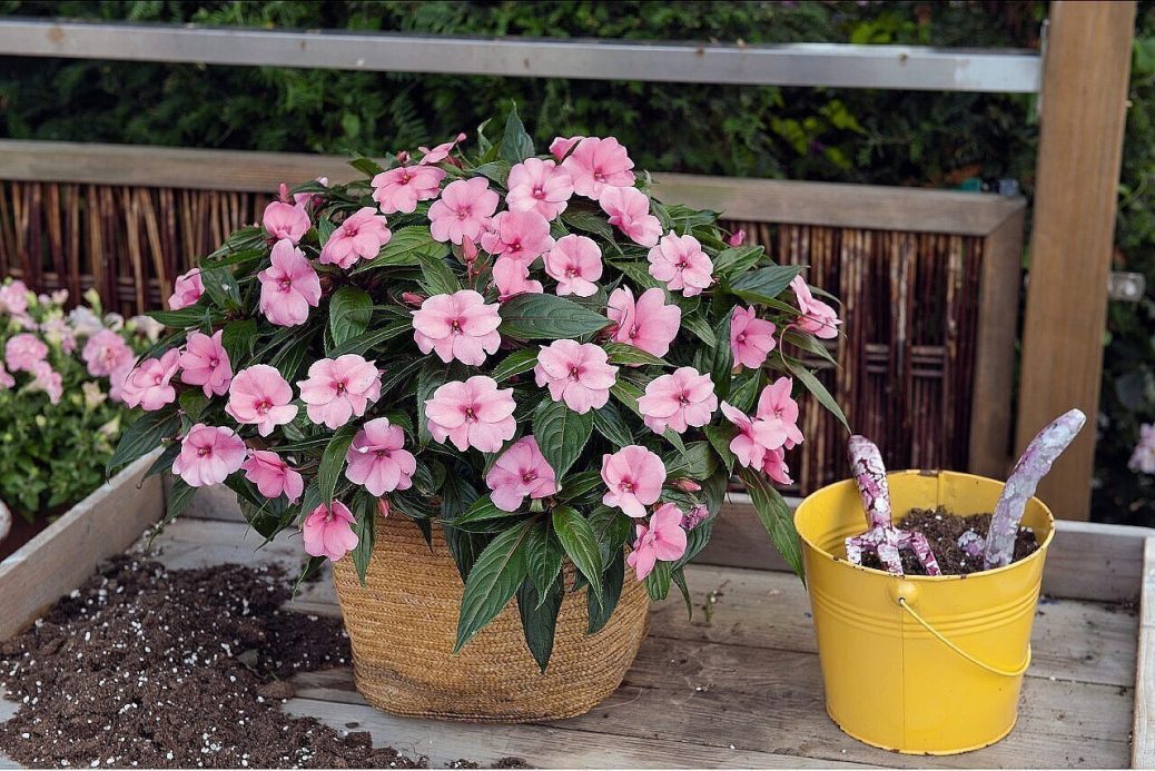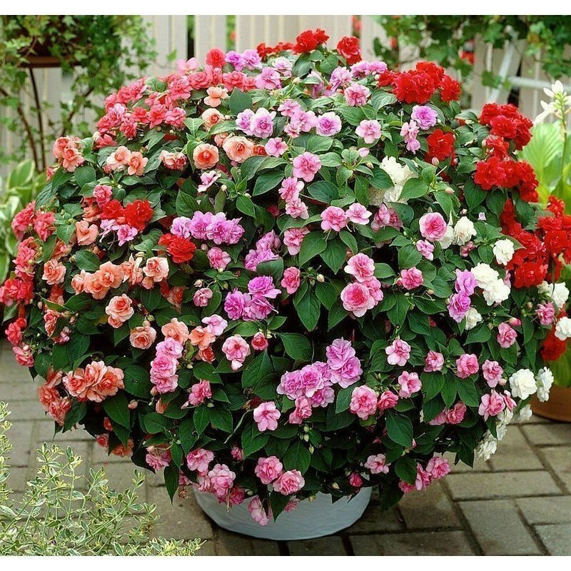 Горшечная группа — микс разных окрасок бальзамина в одном ящике — эффектный пятнистый акцент на балконе