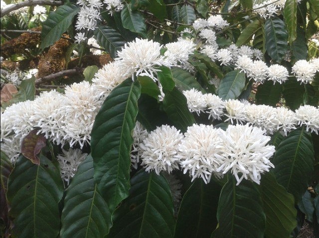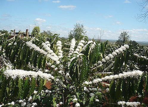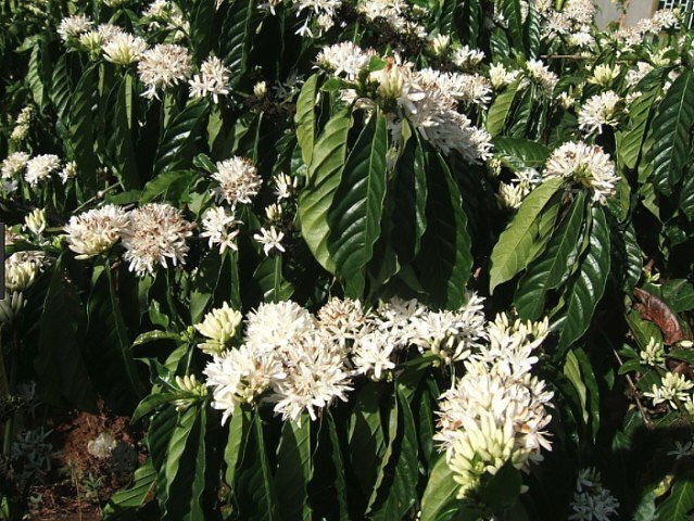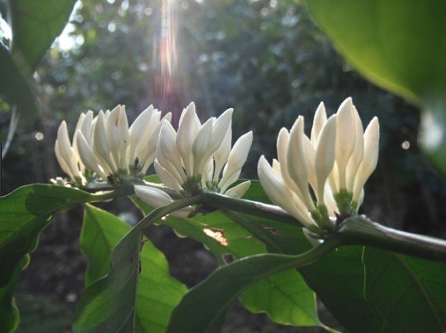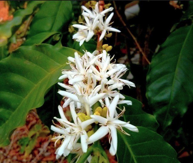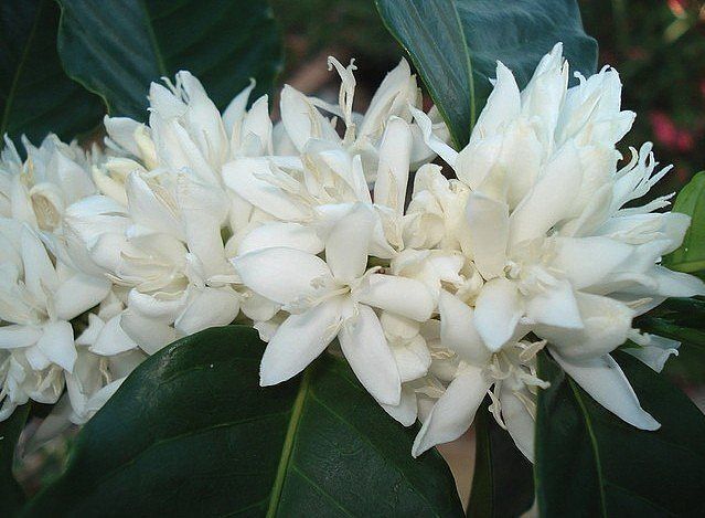 Пробуждение после покоя — при стабильной влажности и температуре кофейное растение выпускает ароматные белые цветы, обычно весной или после обильного полива.