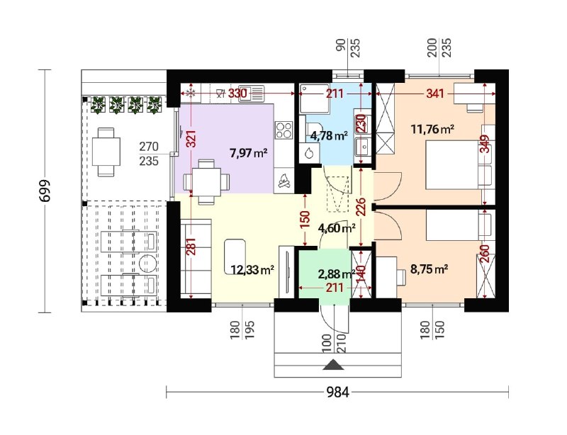 - Кухня — 8–10 м²: разместить рабочий треугольник вдоль одной стены или в Г-образной планировке.