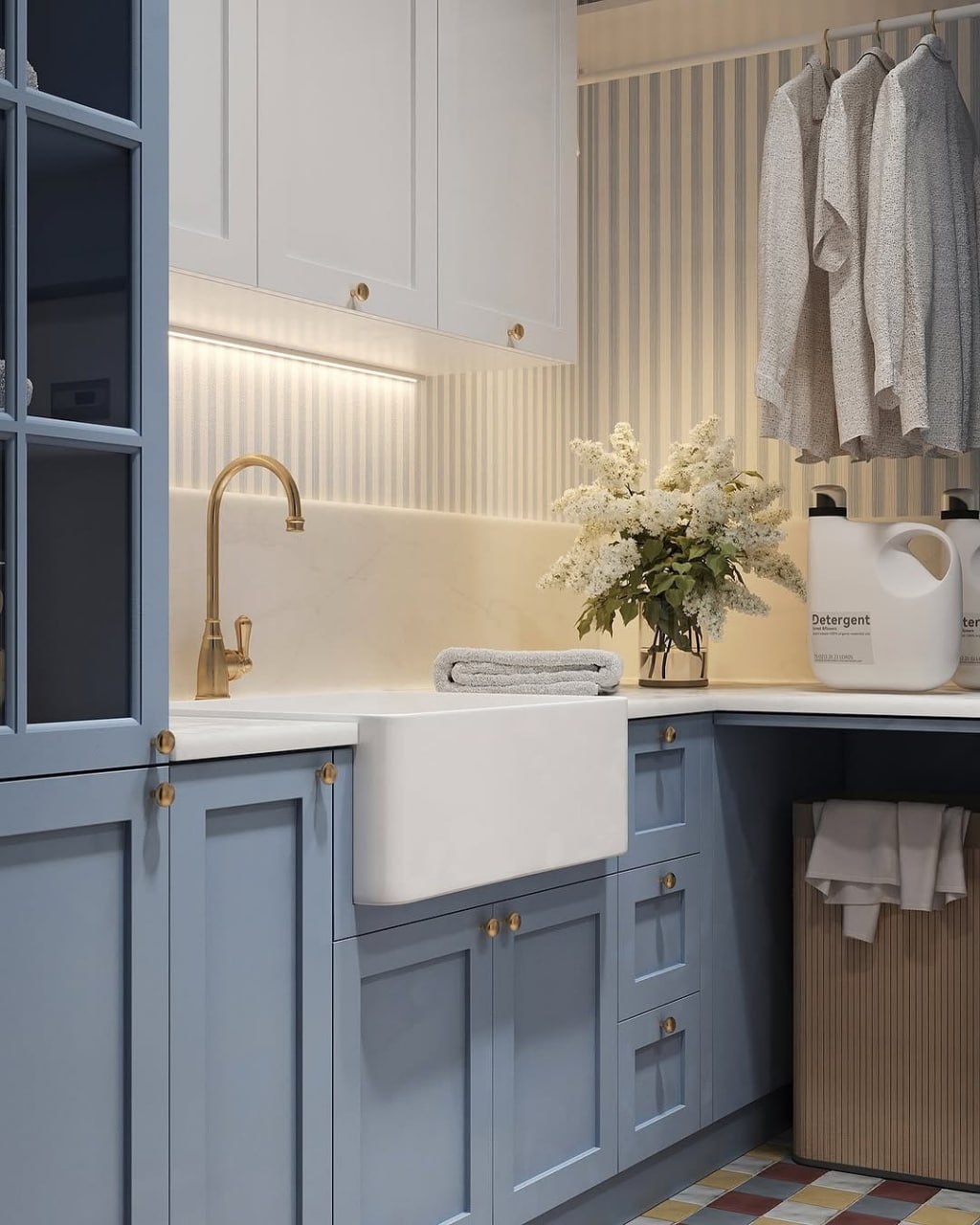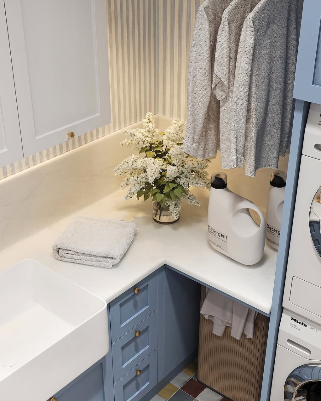 - Фасады шкафов — влагостойкий МДФ в белом или нежно-голубом оттенке, ручки скрытые для чистого силуэта.
