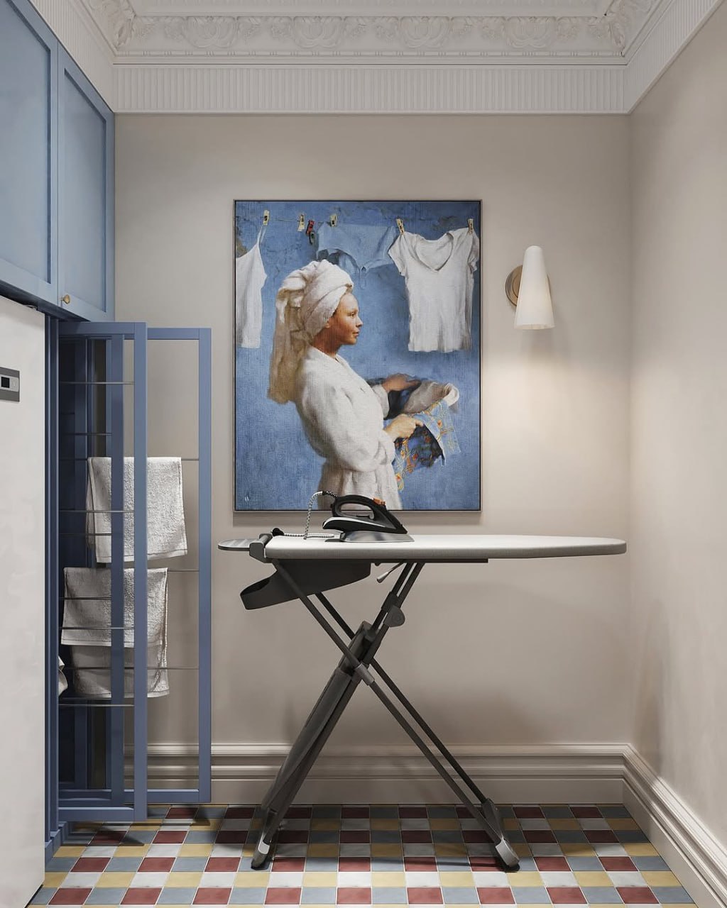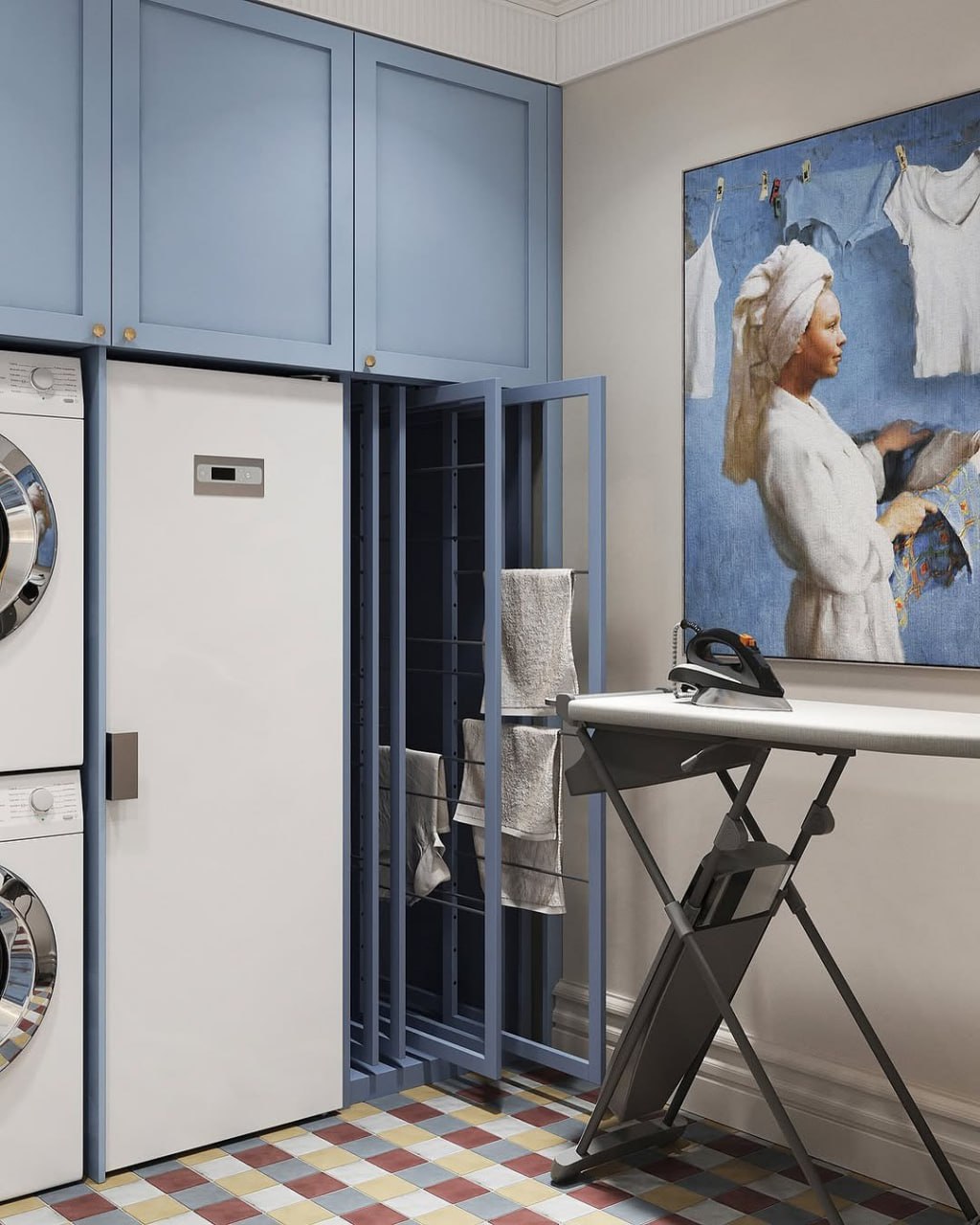 - Модули у входа: складной сушильный рейлинг и откидной стол для складывания белья, который убирается в нишу.
