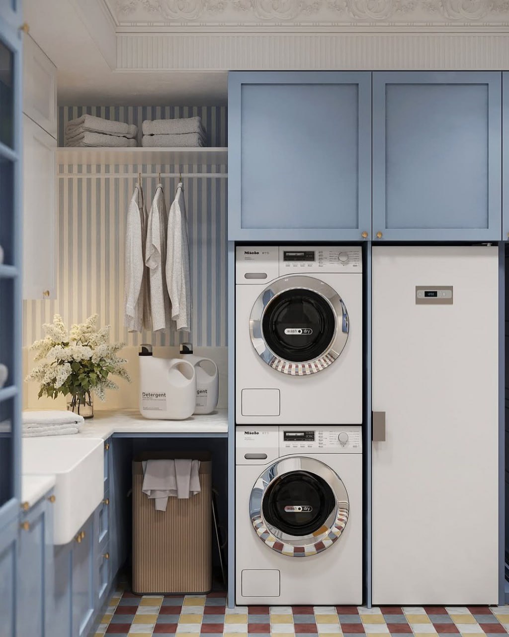 - Встраиваемая техника: если позволяет глубина — встраиваемая стиралка под столешницу или колонна для стиралки/сушилки.