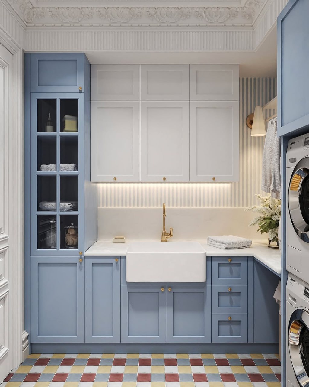 💡 Совет: — Используйте светло-голубой тон 10–15% серее внизу и на стенах до 140 см, чтобы легче скрывать брызги и грязь при сохранении легкости пространства.