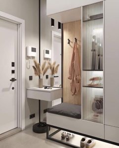 - Комбинируем открытые полки и крючки: сверху полка для коробок и декора, снизу — крючки для сумок, ключей, зонтов.