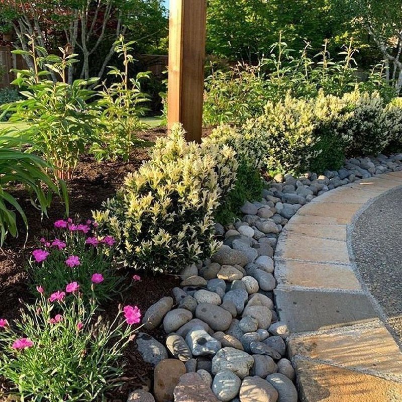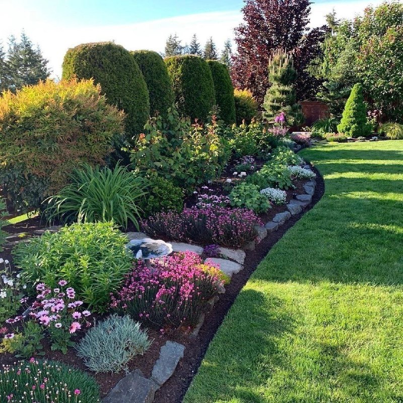 - Акценты из камня и дерева — каменные бордюры и деревянная скамья для теплого характера