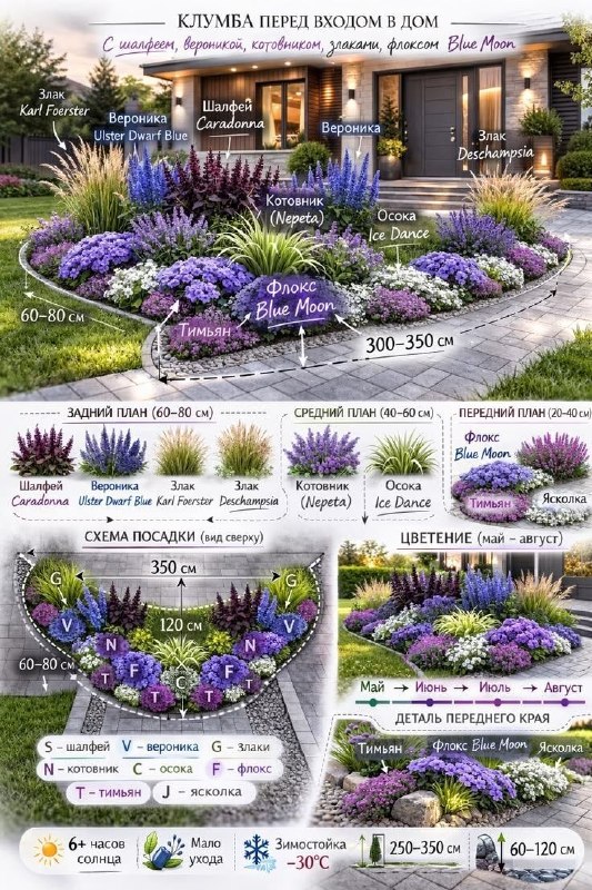 💡 Совет: — Выбирайте многолетники с разными сроками цветения (ранние, средние, поздние) — клумба будет выглядеть интересно весь сезон🎨 Вариация: — Сделайте мини-клумбу в геометрической форме (круг, полукруг) у ступеней — легко держать форму и симметрию📐 Расчёт: — Для полосы шириной 1,5 м и длиной 5 м (7,5 м²) при плотности посадки 4 растения/м² потребуется ~30 растений; мульча 5 см — ~0,375 м³Лайфхак: — Покупайте крупные саженцы в контейнерах: быстрее закрывают пространство и дают видимый эффект уже в первый сезон