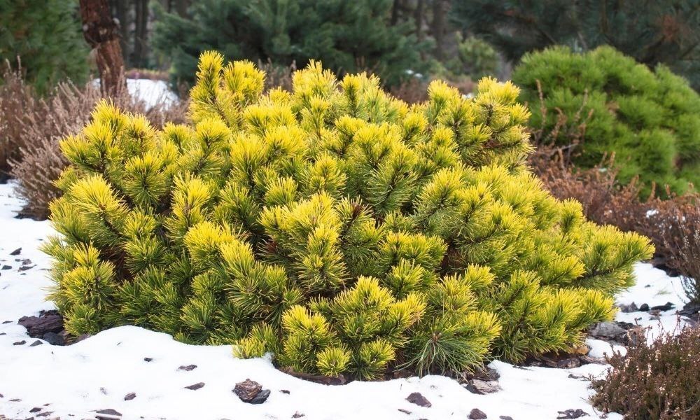 2. Золотистая хвоя зимой — создает контраст и оживляет осенне-зимний сад