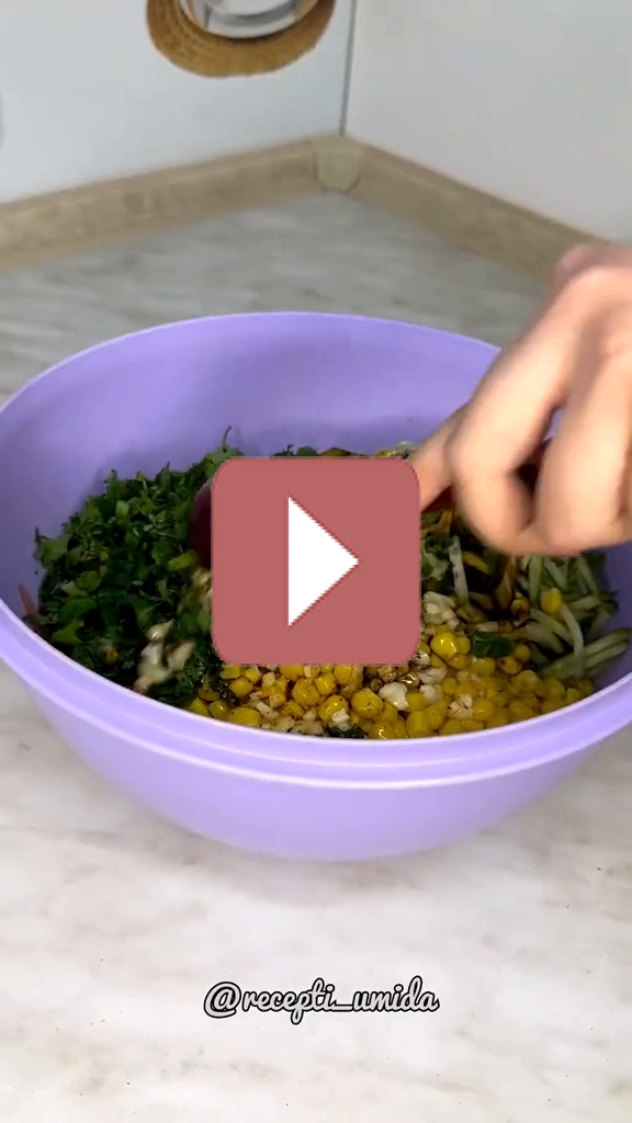 6. В большой миске соедините мясо, овощи и кукурузу. Полейте тёплой заправкой, тщательно перемешайте, добавьте чеснок, кинзу и доведите до вкуса солью и специями.