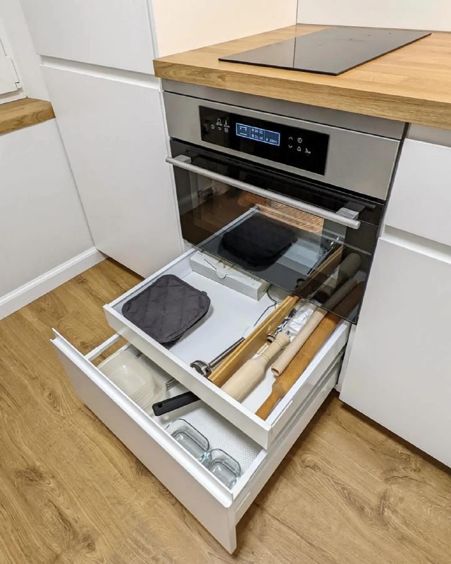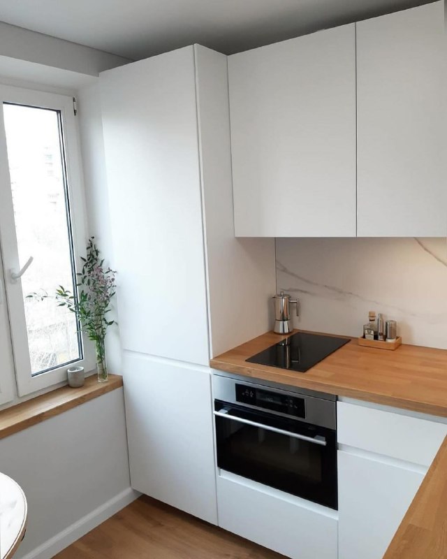 - Тепло и текстура: дерево смягчает холодную панельную эстетику и делает кухню уютной.